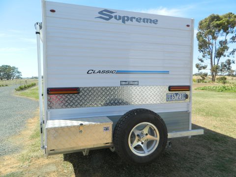 I have one on the left side 900 ml wide280 H 350 deep, when I recently picked the van up from Supreme after having it repaired from a smash I asked them about putting one on the other side .They informed me that the rear bumpers on my model are all designed to take 2 spare wheels and 2 full jerry cans . So I would simply make a call to your maufacturer. Mind you I often can,t wait to pass a caravan that has a motor bike on the rear !! John