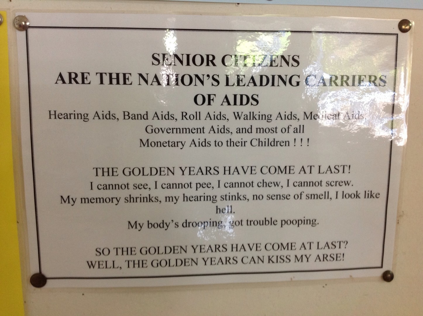 Sadly I can relate to that sign. On the upside, I don't care too much what the body is doing, as long as it continues to take my mind to all the places I want to go and still allows me to enjoy (with the help of some of those medical aids of course)