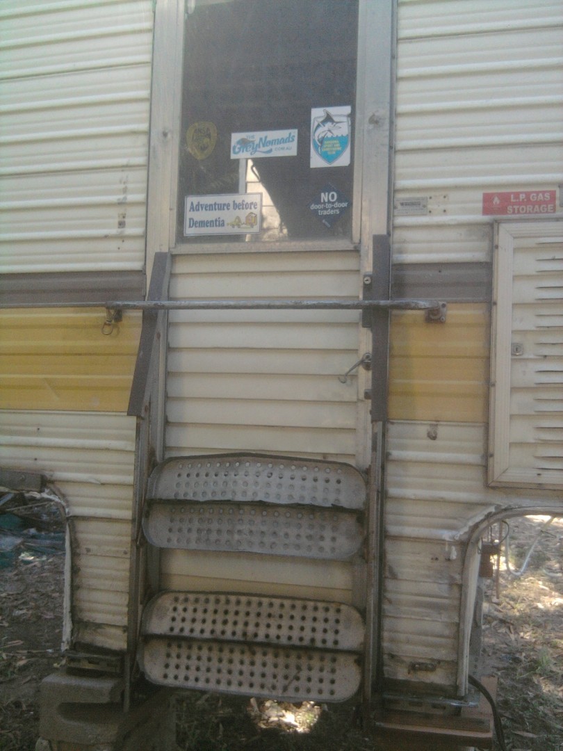 Here is a coupleof pics of the railat the back of my camper. It swivels around and acts as a security bar which holds the stairs up, andyour can lock it with a padlock works well. Shouldn't be too hard to make. The rig will be a lot more stable now you have removed the box.Sorry, can't do anything about the fuel consumtion. 2.6ltr petrol mazda/ford engines use a lot of fuel. Might come down to see it(and you), later in the year, if you are around. Bill