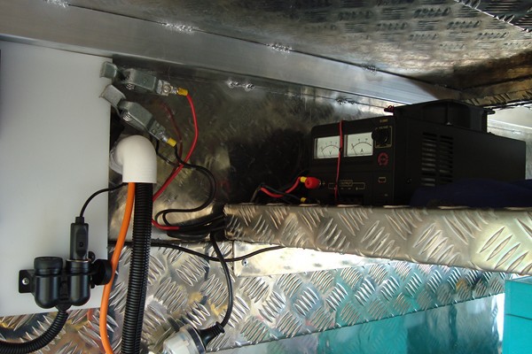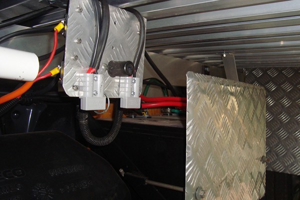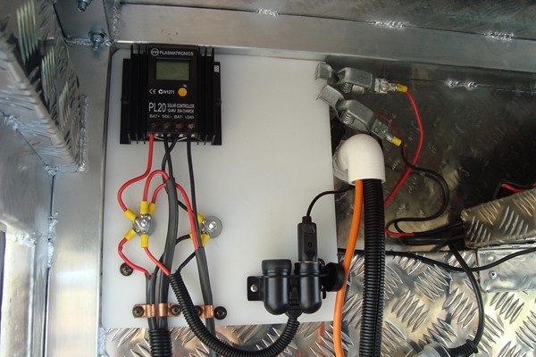 I have setup the new tug with a connection point near the batteries for the portable solar to be pluged in when camping, also houses a 12volt output, a battery isolater switch & saftey switches mounted on the rear of same panel.