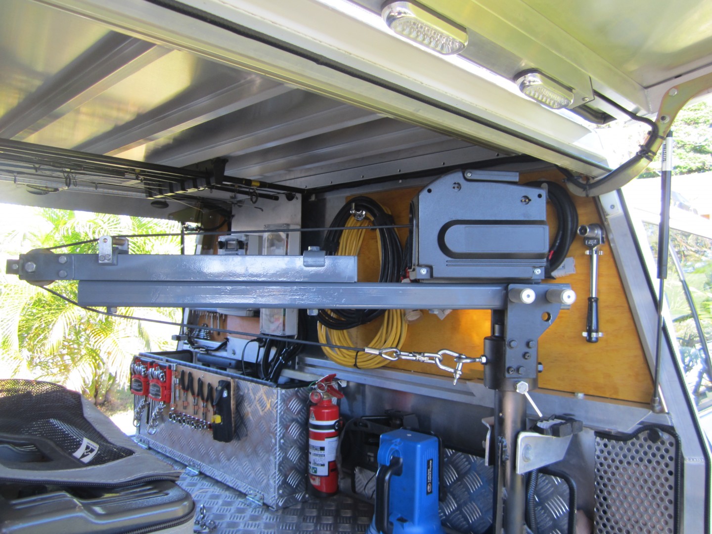 Yes, we traveled around Oz for 15 months about 2yrs ago as i looked at heaps of set-up's Bryan. I came back completely confused, so I went about thinking just what I wanted and where, as you can see the set up is user friendly and the small boxes on each side of the rig are great, fishing rods 8 in all hanging from inside the roof is magnificent and the moblie crane is re-moveable and can be ex-tracted from the trucks workshop.