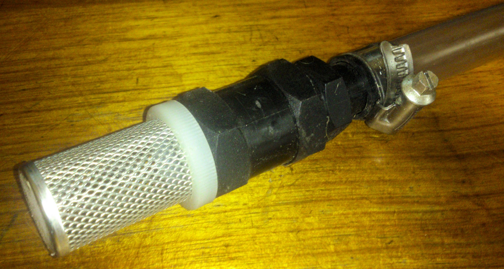 This is a 30mm diameter mesh suction filter suitable for Shureflo diaphragm intake systems. Available at most irrigation suppliers at reasonable cost. Works well for me on my van with a 6m suction line (approx. 1.5m head) and no foot valve, pumping into 15 m of garden hose. Shureflo positive displacement diaphragm pumps have great suction line capacity and in my experience are bloody brilliant!