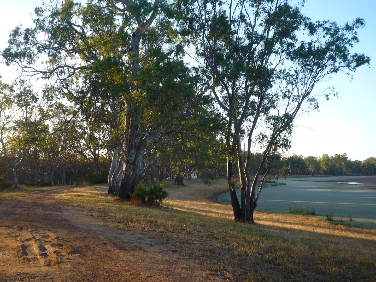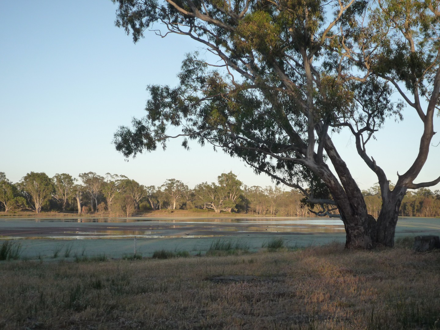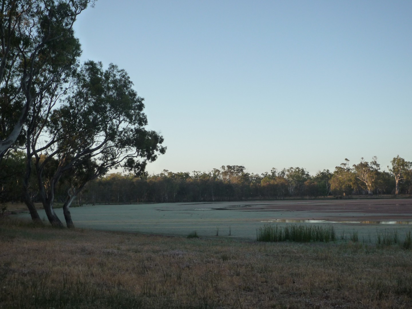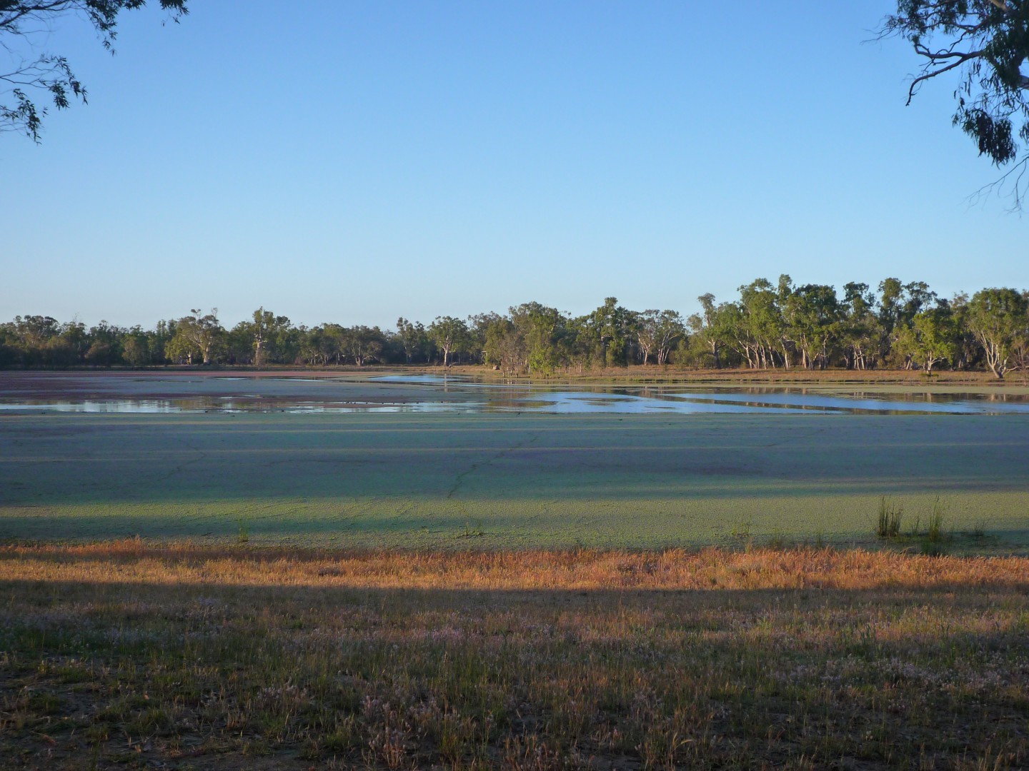 Juergen, it is duck weed that is growing everywhere. Seen people with yabby nets, not sure about the fishing side of things. If you like the real bush setting it is a perfect place to camp. Out of the way and not many people are around.