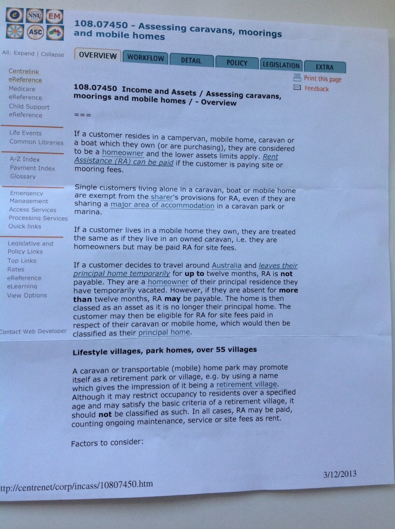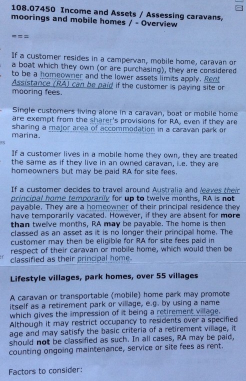 What this form from centre link basicly says ,if you own your own home you are not entitled to rent assistance while travelling in a caravan or motor home for twelve months, but after twelve months you may apply for rent assistance and may get it,anybody that owns or buying a caravan or motor home and living in it is classed as low assets limits and can apply for rent assistance ,that is full timers on the road,also boat owners that live on there boat and are paying mooring fees can apply, this should explane it briefly.