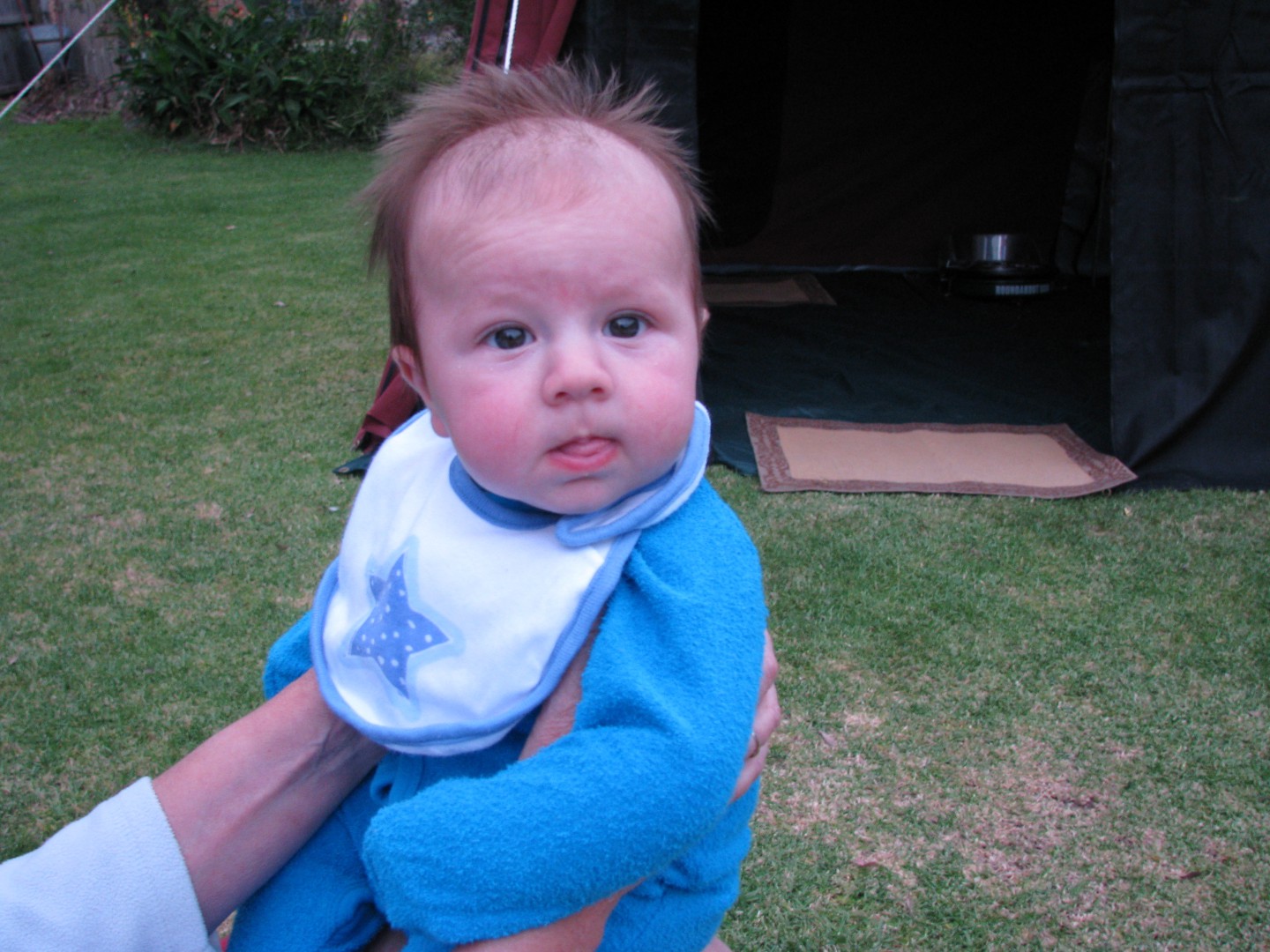 anyway they got what we thought was a good deal, and we have helped them set up with tables, chairs, BBQ, gas stove etc, etc etc its amazing how big it is inside and overall. Both boys as I write are asleep in their respective bed's/cots and where quite happy to settle down. It is unbelievable what is out there for camping now a days it has taken us 30 + years of work before we could afford a caravan, oh well good on them I say they are going to live the dream and also come with us on some trips. the last photo in the group is of the newest grandson Jye, who is 3 months old, and he is enormous.