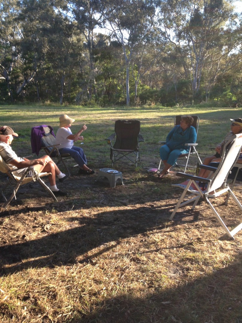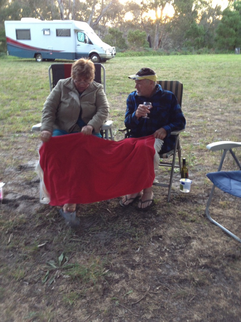 When we arrived yesterday afternoon there was another couple already here, had a chat and decided that Happy hour was not too far away. So Rod, Sue and I set ourselves up and under the shade of the Cyprus Trees we settled in with a drink or two and a good chat. Not too long to wait before another caravan pulled in, we yelled out for them to join us and over they came. A beautiful couple, who provided more conversation and laughs. As the evening wore on, it was determined that Rod knew these people from years ago and then the original couple had met the new couple at a free camp a few weeks ago and then to top it all off, the new people knew Kevin and Kim at Greens Lake. So the world had just become smaller again. After a very raucous telephone call to Greens to re-introduce every one again, it took us another couple of hours to complete Happy Hour, and then it was only disbanded because it go so darn cold. I will tell you how cold it become, I went and put my dressing gown on (over my clothes), to keep warm, and because of fire bans we were not able to light a fire.