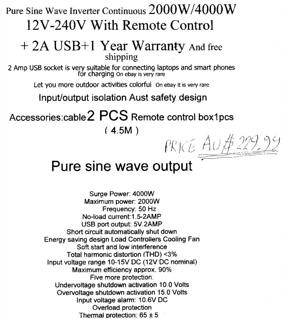 Hello to all you electrical wizards, i need some advise. I am in the process of attempting to setup a 12volt system that wiil free me from the grabbing hands of some of the sharks out there that have gained control of the caravan park industry. I know that description does not apply to all but theres enough of them to cause me to stop using caravan parks if at all possible. My immediate problem is i need to install a 2000W inverter. After a great deal of searching i have found one i can afford, but can i be sure its safe. The ad says that it is built to australian standards. Attached is the specs for it. My question is "would you buy it". Your comments please.