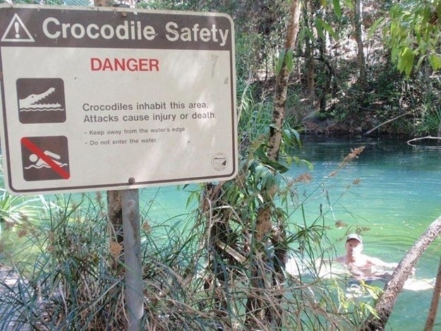 We were in Cairns years ago, and there were towels hanging over a sign like the one in the top photo. People were swimming. I'm surprised there's not more croc attacks