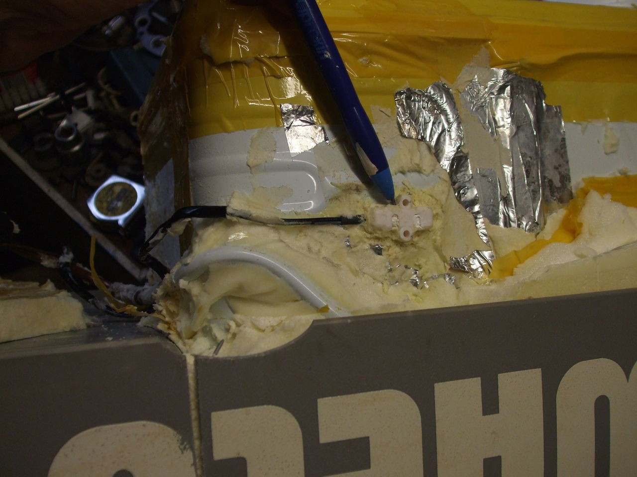 all cut and glued in, there is 3 pieces but was trying to find the wire. the fridge bag will cover the joins I put a small hole on the out side of the compressor so now there is no need to take the compressor off at all Quick easy fix, pull pieces out, did out foam, glue new thermistor in and plug in thermister to the board, stick piece bag on, ALL FINISHED I would also like to thank DEBE ,Daryl, for his help on this Regards Peter bloody hell, hope it all works after all this