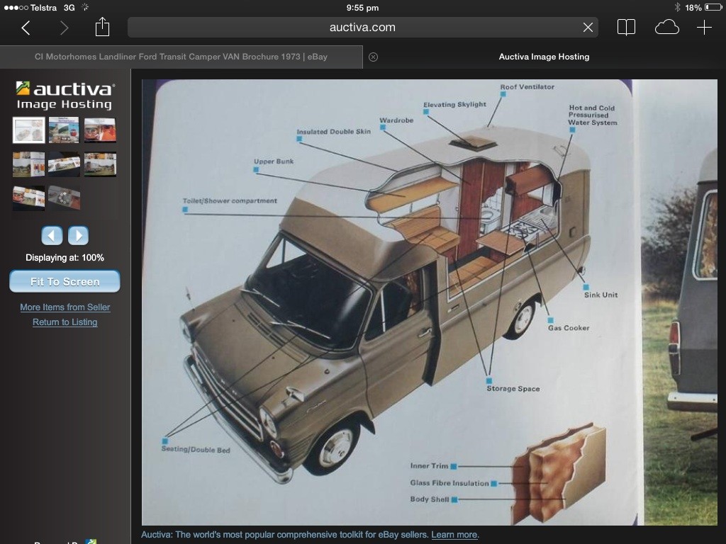 From the brosure. I have the original fridge and stove that work great but the shower was brittle and had to go west as did the gas unit above the sink. Just too dangerous. I'm cutting the over cab disaster down by half but I wish I had the skill to remake the original over cab front. She runs brilliantly though and is very fun to drive. I can't wait to have adventures in her.