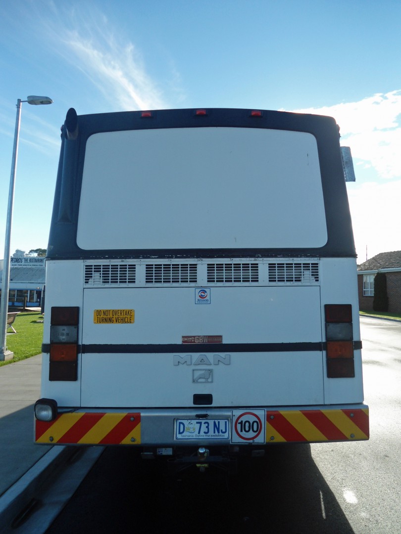 She's a 1992 MAN 10180 cylinder diesel mini-coach. She recently (just finished today) got her windows removed to be reclad and have motorhome windows fitted. We think she looks great! The work was done by CP Motorhomes in Ulverstone Tasmania; they were fantastic with us, would recommend them to anyone. She also has a built in tyre inflater thingy (attached to her airtanks), which comes out the front bumper, as seen in the last picture - Troy built that.