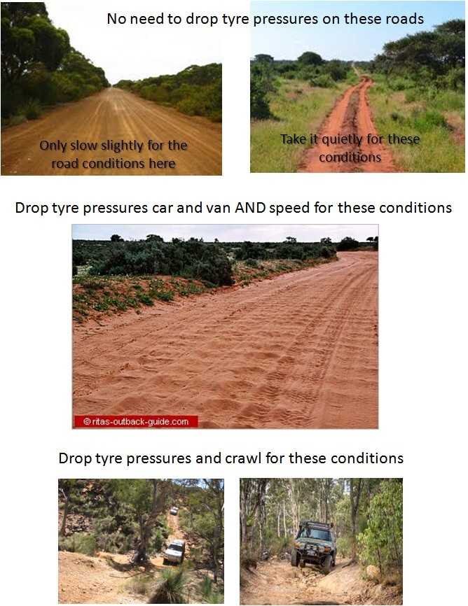 Think about it, how many times do you see people living in the bush stop when they get off the bitumen and reduce their tyre pressures, or the other way round. Having spent the majority of my life in the bush, never known any bushie who lowers tyres pressures. The majority use tyre pressure well above what urban people do. We run our road car tyres at 45psi, with light truck tyres, they are always 5-10% over the stated pressures on the tyre walls, same with the bus and never seen a road train or truckie drop tyre pressure when going from bitumen to dirt. Who has got 10-15 minutes to waste aiding tyre manufactures profit growth, not me. As soon as you drop the pressure, the tyre walls bow and tend to de-laminate over time especially if you are carrying any weight, which will effect the tyre wall and tread configuration dramatically.