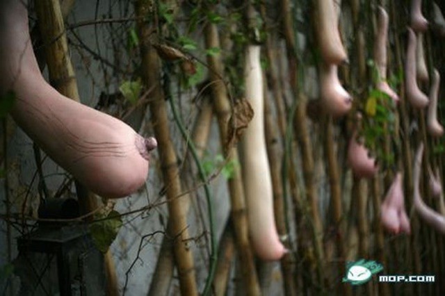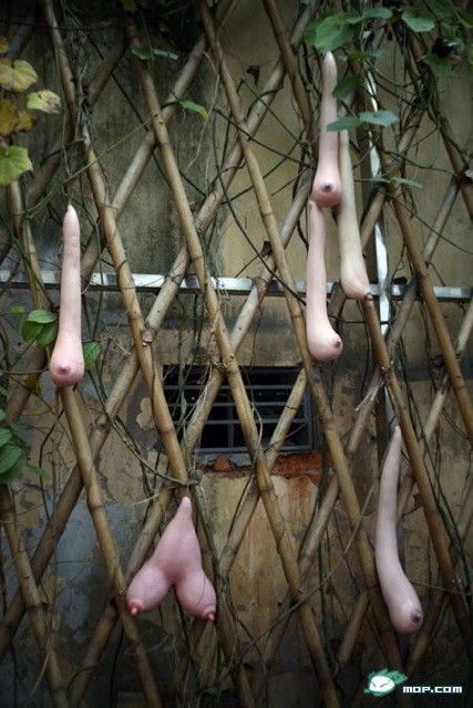 Sadly The objects are not naturally growing gourds or pumpkins as claimed. In fact, they are the work of Vietnamese artist, Nguyen Thi Hoai Mo and are made from silicon and other materials. The artwork luffas graced a wall at the Goethe Cafe in Hanoi.