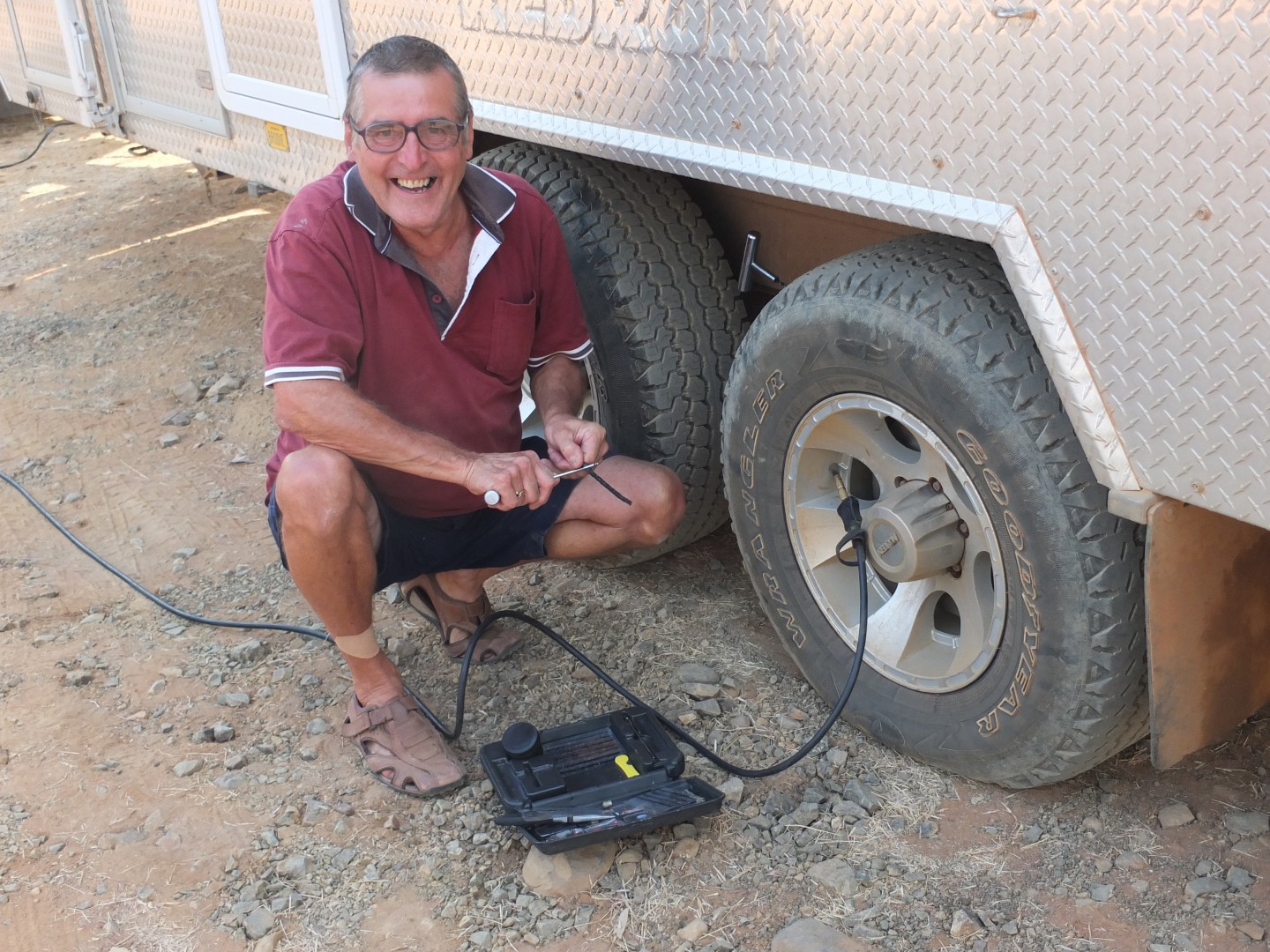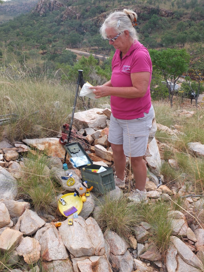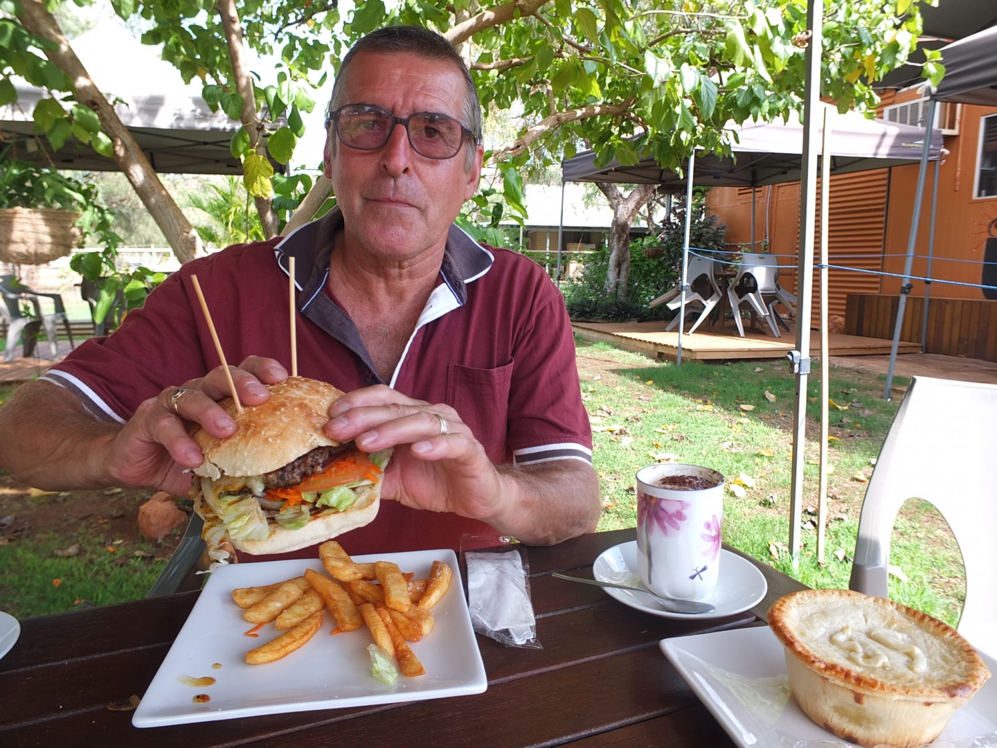Mr D tucking into a Kangaroo Burger at the Imintji Roadhouse - and me finding Wombats geocache!