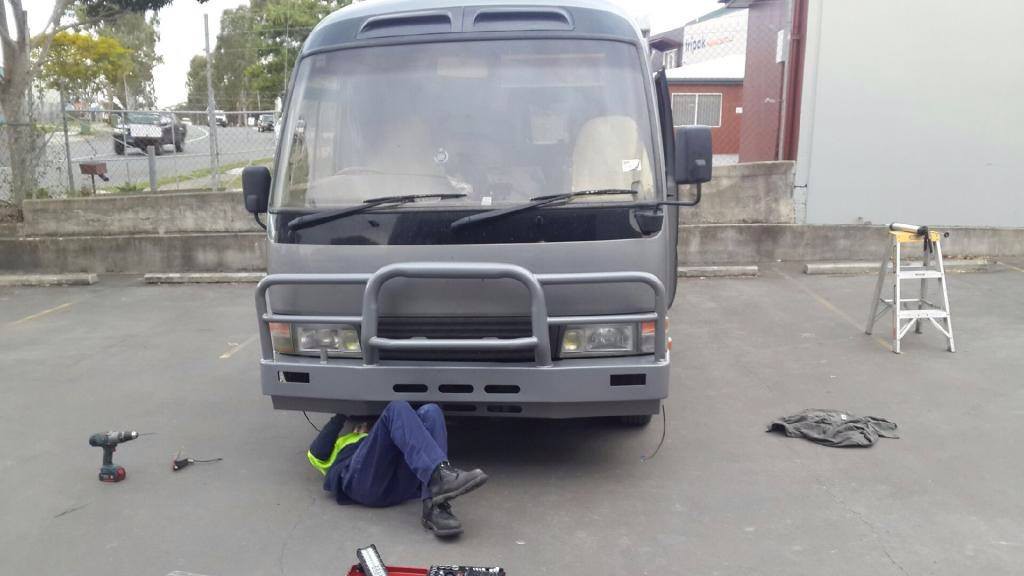 The good blokes down at Turuga Industries of Capalaba in Brisbane are fitting my second hand Bullbar to my Coaster for me after repainting it.