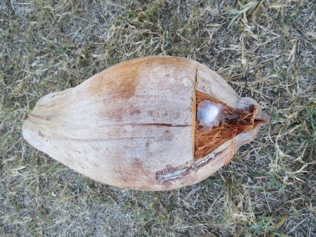 It is very challenging to get at the coconut milk from coconuts that have been on the ground for some time and are brown. I have been using chisels and a hacksaw to get at the internal surface of the nut. The first one got cut and the milk dribbled out but after that I got smart