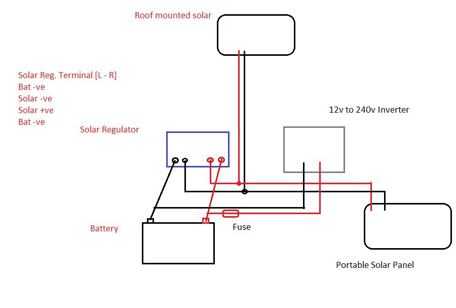 Sorry, the solar on the roof is connected to the CONVERTER only The Converter is connected to the battery's The battery's are connected to the INVERTER The portable solar will be connected to the Battery via 10mm copper core cables and Anderson plugs once modified for ease of removal