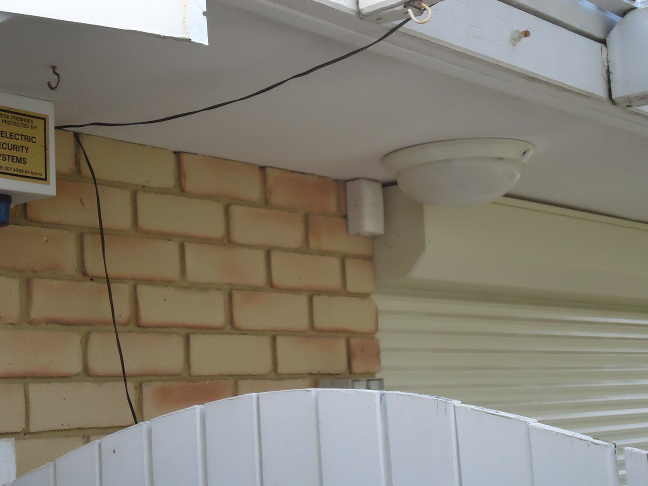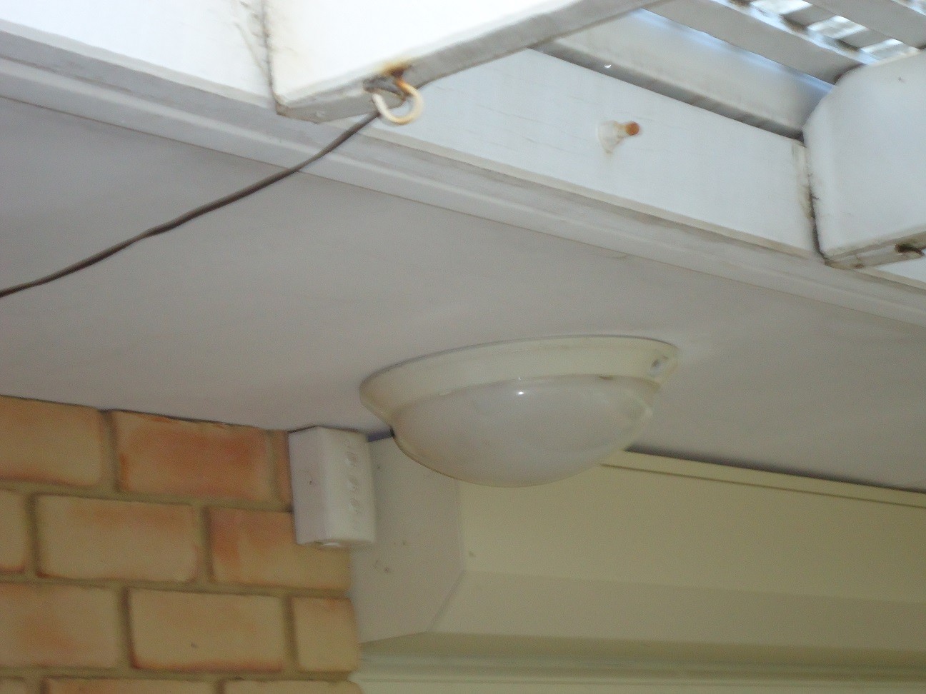 Note the round sensor light near the switches, one further down under the eaves is full of water due to water leaking from the roof into the eaves.