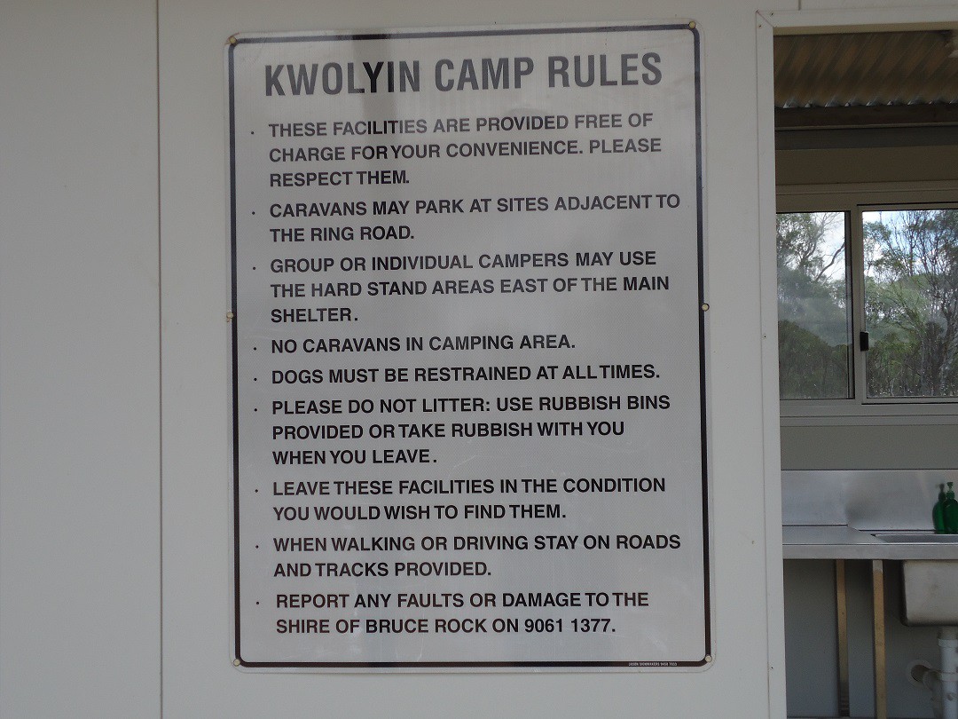 Just spent a couple of days at Kwolyin, town water supply, campers kitchen with gas stove and sink and a tap connection at the rear for filling water tanks etc. Modern flush toilets (septic) male, female and disabled. No showers (but free hot shower at Quairading town rest stop toilet block) or dump point, dump point at Quairading or Bruce Rock.