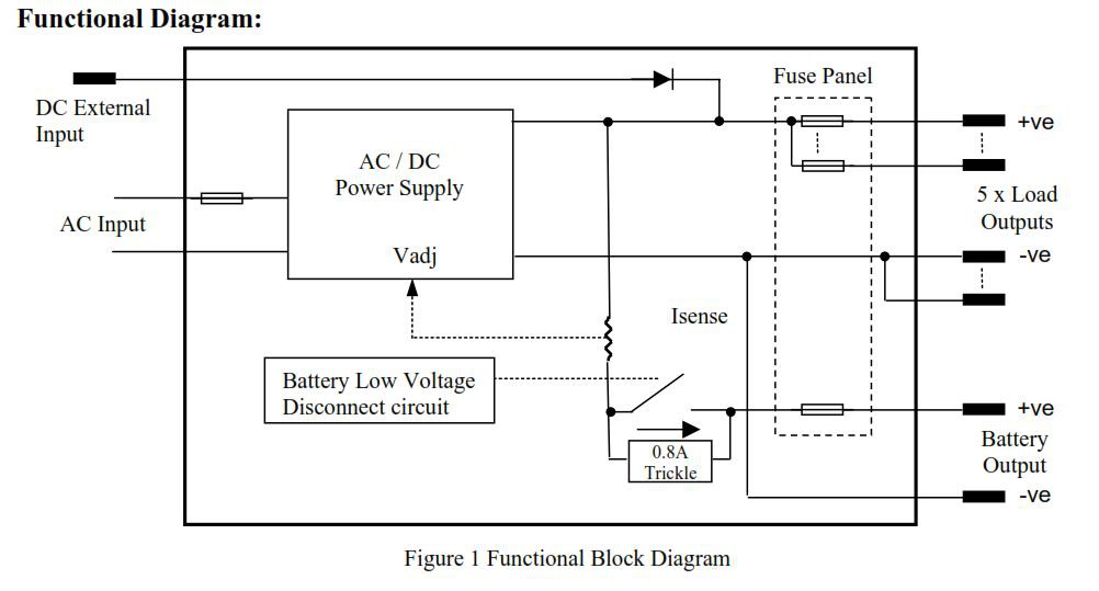 In the functional diagram below you will see the diode symbol in the line from the DC external input.