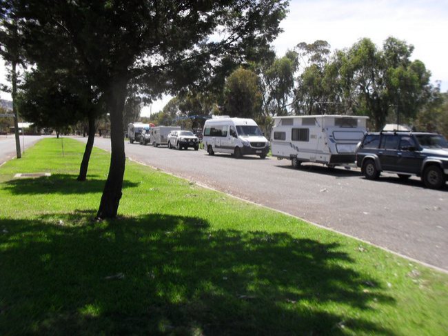 We arrived at 10 am and found a string of caravans camping from the previous night, managed to squeeze in though and grab a vacant power point, as others left, yet more vans arrived, it was full to overflowing by 2 pm with late arrivals having to go on to the two caravan parks in town,