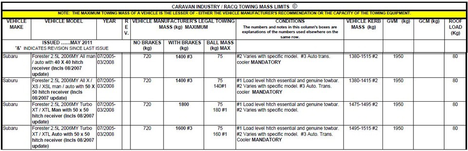 I was looking for a tow vehicle for a friend a couple of years back. We had to bypass the forester because of the low towball down weight. (We were told 80kg, going by Johns chart it's lower) She had around 150 kg. Pity because there was some nice 2nd hand foresters around. She ended up with an Xtrail.