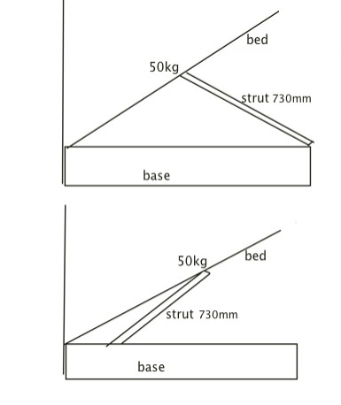 The 1st question is, as there will be 2 struts, what should I allow for for each individual strut? 25kg(245newtons) each or 50kg(490newtons) each? I think I'll be going for long struts, about 730mm long with the stroke being 330mm.