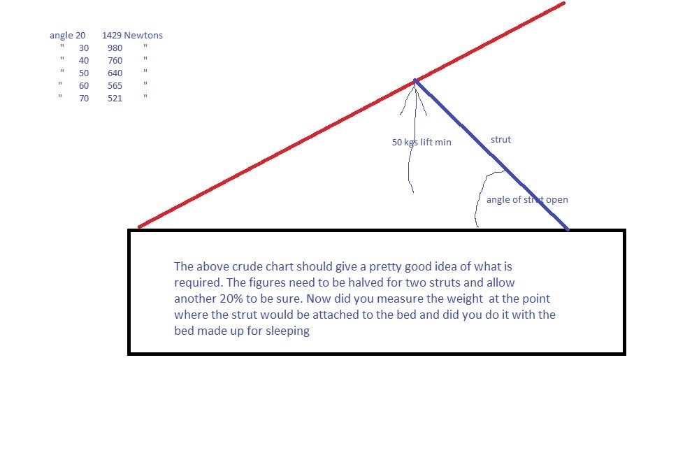 Jon if you can work out the strut positioning to suit the strut length, lift the bed and prop it with a piece of wood the same length as the strut where it would be. Then just measure the angle of the piece of wood as shown on diagram with a kids protractor and estimate the strength needed from the table.