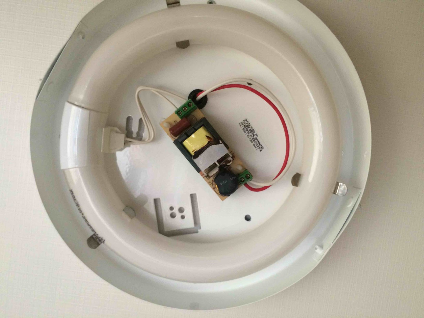 The Red and White wires going in will be the power, one + positive and one - negative most likely the red wire will be the + positive but you'd best confirm that with a multimeter. Thankfully the wires aren't soldered so its just a matter of unscrewing the terminal blocks to remove the wires from the circuit board. If possible I'd isolate the power before playing with it though, you could do that be removing the "lights" fuse or disconecting the 12 battery. Then its just a matter of removing the existing circuit board and the fluro brackets to fit up the new led.