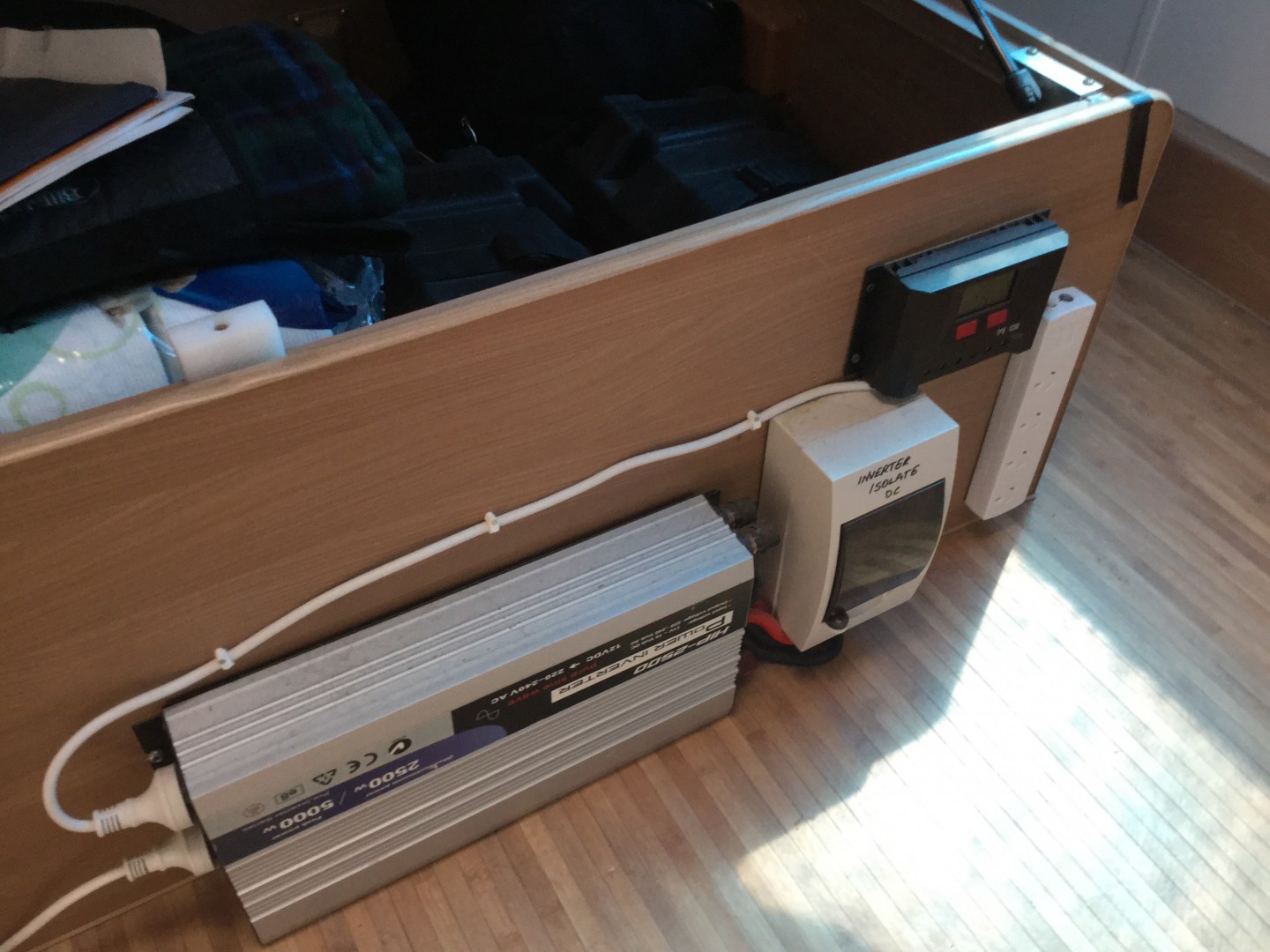 This kept the inverter close to the batteries which I prefer to have outside the living space.