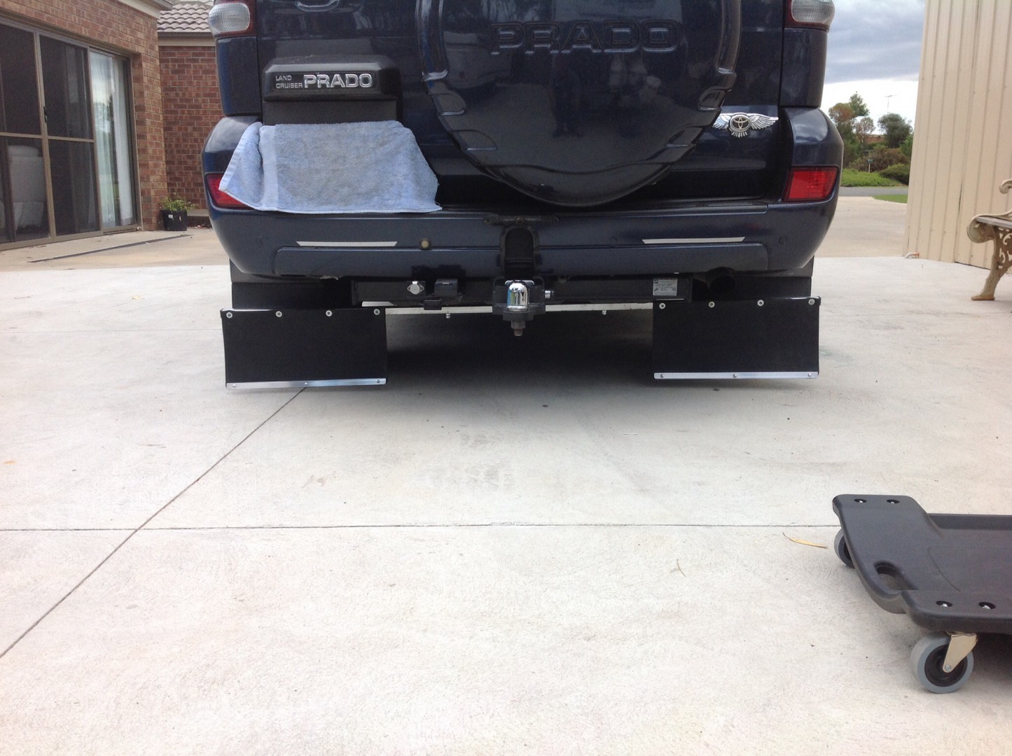 I too have a 120 prado, and I made a set of flaps just like your,s , about three years ago. since then I have made a few alterations,,, I found that they were too low and created more trouble by lifting stones when they touched the road. I have found after several trips bush that for me the best height from the ground is 5.5 inches , no more marks on the lower part of the van and no stones on the draw bar and pole tube. but I found marks higher up the front of the van... I found that the stones etc were coming over the top of the flaps bugger! , how do I fill that space without making it look stupid and have a floppy rubber bit sticking up , well I made up a template out of cardboard from the outside edge to around the third bolt on your flap. this template reached up to the body and followed the contours of the body on the outside keeping about 3mm clearance and staying plumb with the outside edge of the flap ( note. on my prado each side is different ) . I used tis template to mark out the shape on a piece of aluminium about 2mm thick , after cutting out the shape and checking the clear ance I then used a good contact adhesive and covered both sides with rubber. I then bolted it on with the other looks ok and it works, last trip on the dirt was around 350k,s and no new marks anywhere