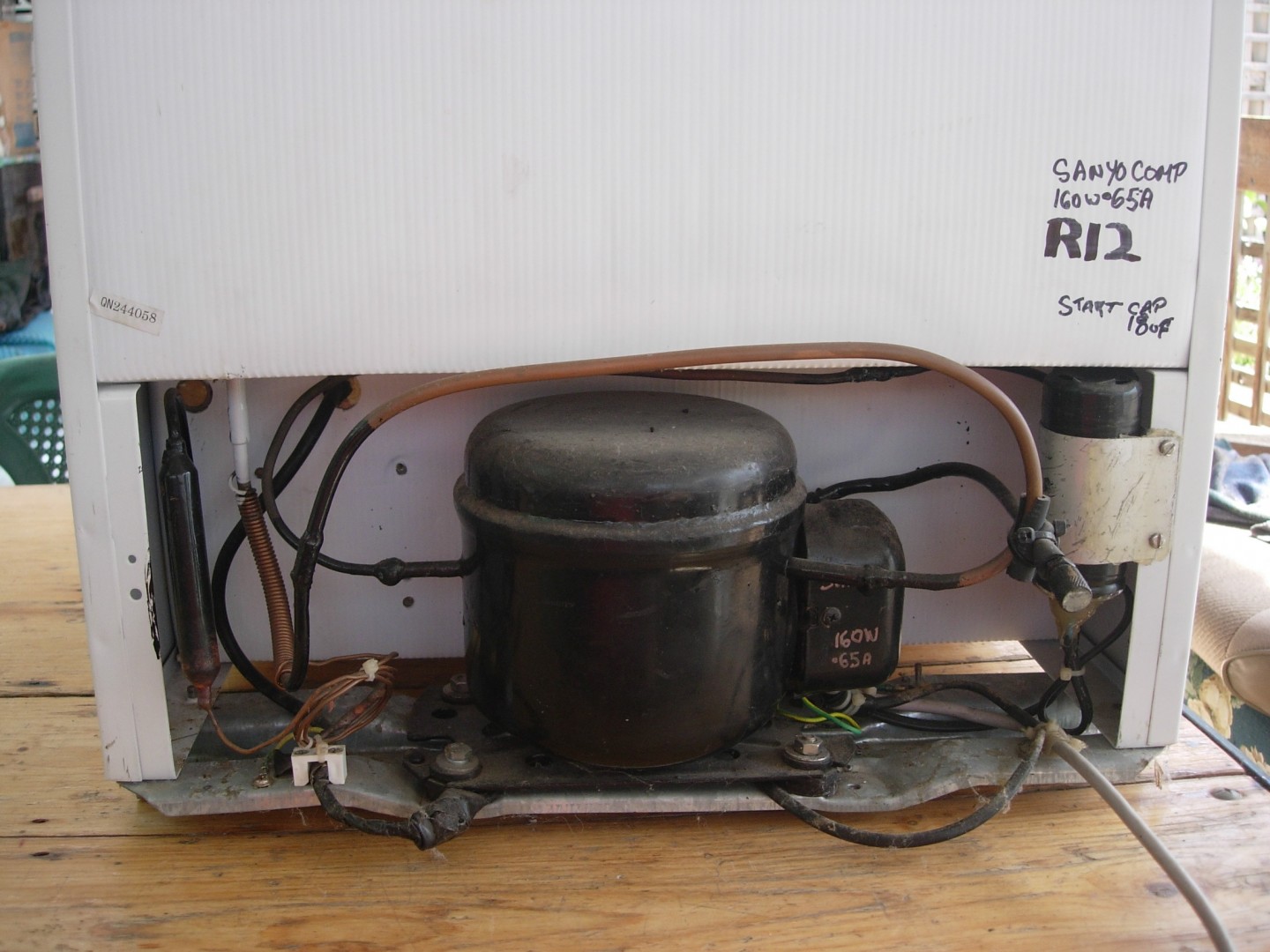This is my personal experience in using a bar fridge in a caravan. It was a new fridge in 2007 when purchased & cost $80. It had to run off a Honda EM500U generator (450Watt) as well as a 300watt Modified sinewave inverter. As purchased it wouldn't run on either powersupply as the start current was too high. One option was see if the orig compressor would star by fitting a start capacitor, this didn't work. Next step was fit a Sanyo compressor that I knew would start with those powersuplies by fitting a start capacitor. In one picture is the original specs & the specs of the sanyo compressor along side. The current draw after about 20 min is .45A on 250Vac (what we have here). The condencer pipes are in the side walls on this fridge as are most these days. Pics of the Evap temp & discharge pipe 40 mm from the compressor. The fridge when in my van had about 50mm clearance on the sides but was fitted where the orig 3 way fridge was. This fridge did work well in all heats & on the generator & the 300W inverter when travelling On 12 Vdc the inverter drew a bout 10Amps