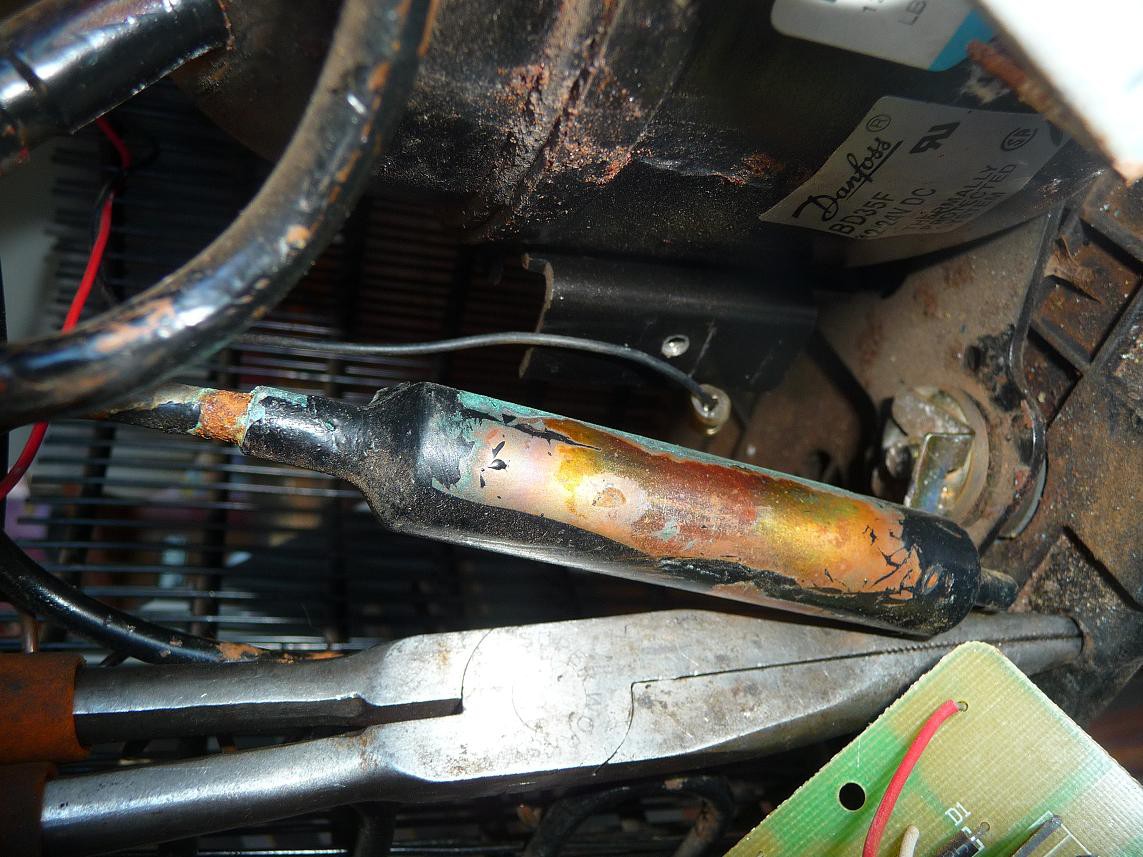 cut out s/b 10.4V and cut in 11.7V (correct?) so supply voltage/voltage drop should not be the problem. i have also bridged the T and C connections to the thermostat - there was no change in function and the compressor does not run. my research suggests a fault in the 101N0220 controller. i have removed the controller and found nothing wrong visually with the internals and would like to test it but can find no info to do so. i also checked for shorts between the 3 pin connector on the compressor side and the compressor housing and found no continuity/shorts. i checked continuity between the three pins on the compressor and found nothing in excess of 2.0ohms between any of the connections. as a result i have concluded there is no short in the compressor. i have noted two points in the refrigerant lines that have slightly rusted and there is some light blue corrosion surrounding the lines. corrosion appears near the thermostatic bulb and the other on the compressor return line best i can tell - is it possible this a refrigerant leak? would that set a cutout code if the refrigerant was low/empty? see pics for a better description of this corrosion.