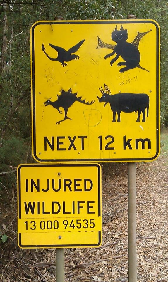 Thought I would share a funny that got me a bit excited. I drove fairly fast past this sign and only just briefly caught a glimpse of this sign on a side turn off from Great Ocean Rd. I drove with anticipation some weird animals could be passing by. There was a Koala and her bub crossing the road but that's it. I followed the same route out so I could see the sign again. Hahaha! Would you like any of these creatures at your camp site?