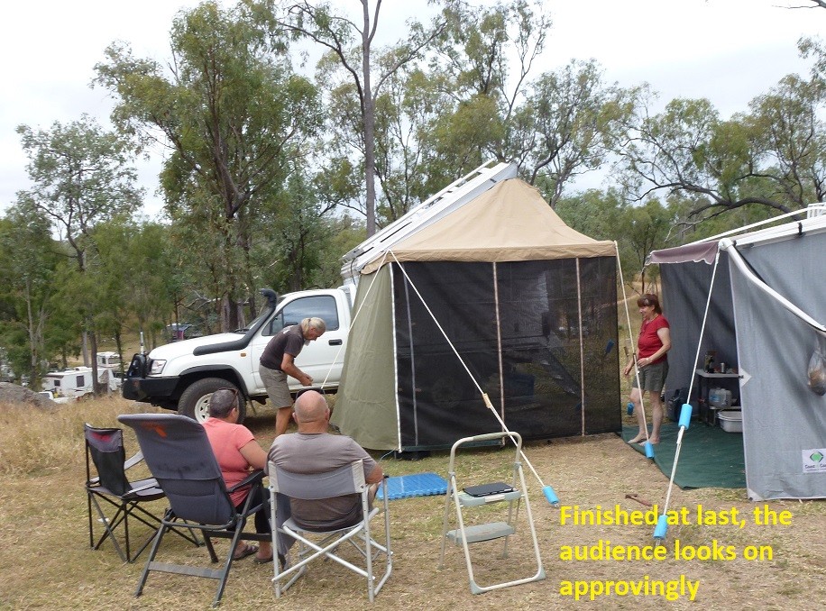 John's visitor Mezzie arrived today with her impressive slide-on camper. The afternoon's entertainment came in the form of Mezzie and some willing helpers setting up her awning and annex, which was finally achieved after several attempts. John gallantly surrendered some of his annex space so that Mezzie's annex could be secured.