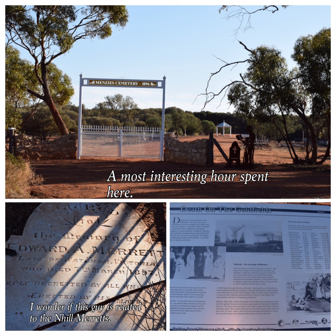 Up early this morning, to pack up and ready to move on again. Fuelled up, and headed out towards Lake Ballard. First stop was the Menzies Cemetery. What an amazing place and so full of history. There are many graves there, a lot belong to infants and children or those cut down in the prime of their youth. Apparently Typhoid almost wiped out the town in the 1800's so that could account for the number of graves. The grave stones were made of quartz, and many made from tin, all turned and patterned. Certainly a very interesting walk through.