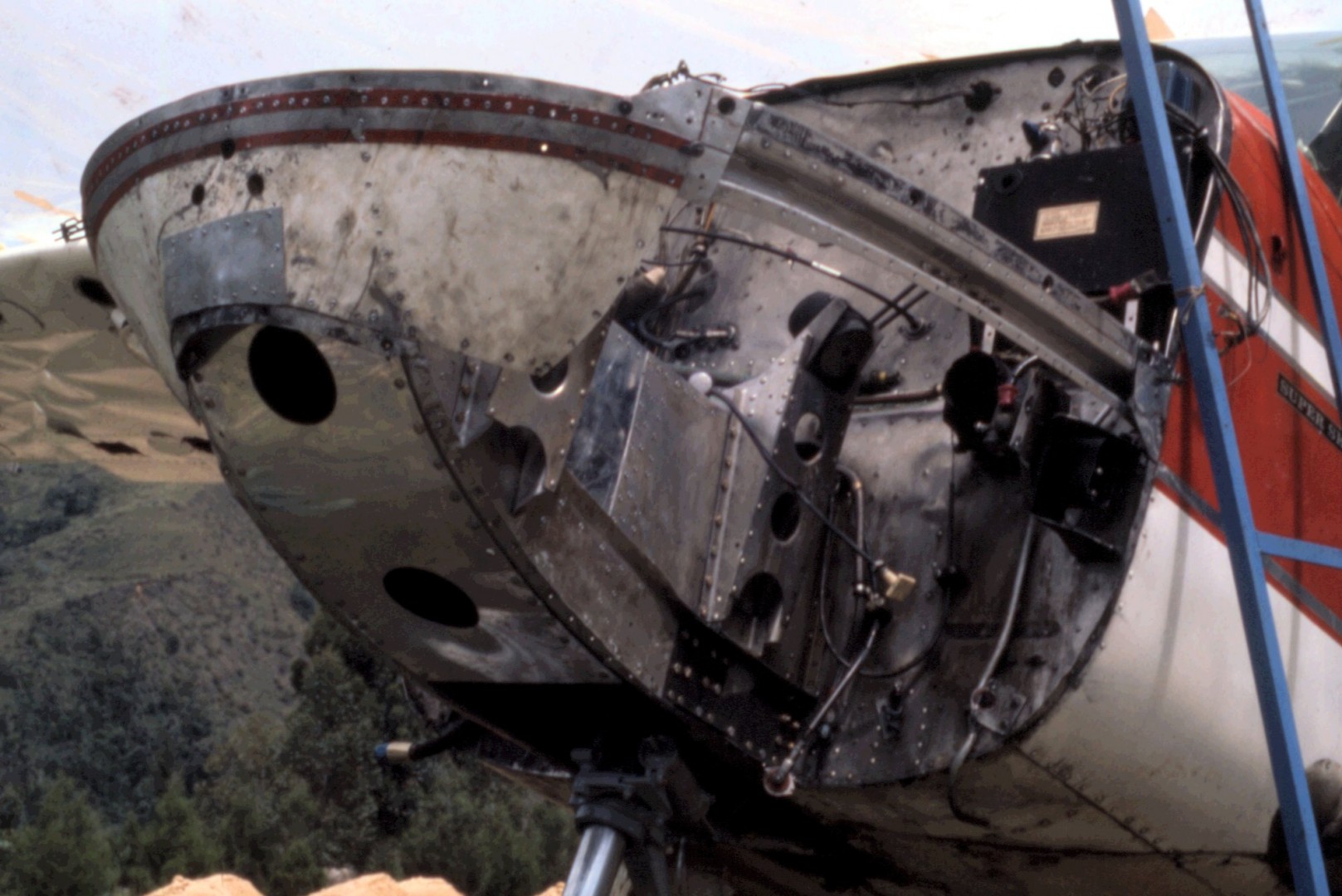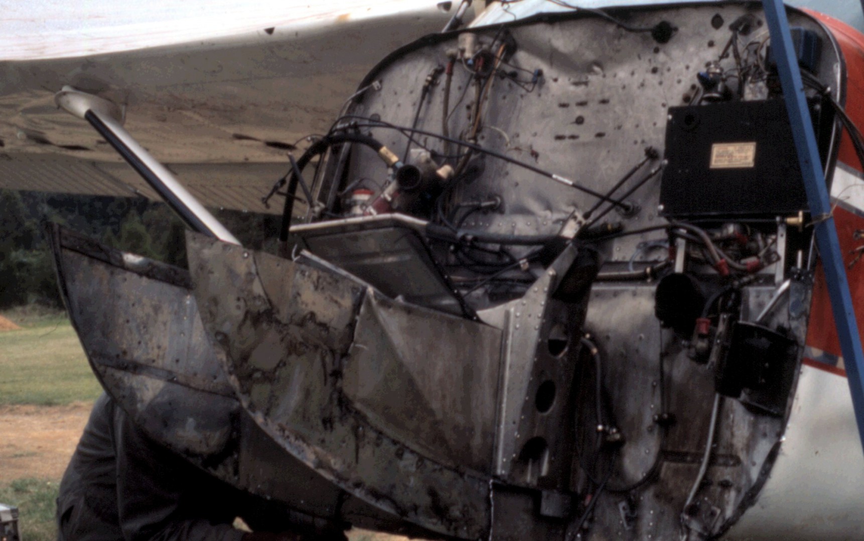 With the engine removed, its all pretty much crunched up. Working from day break and well into the night, we drilled out the rivets, bashed everything to its approximate shape and bolted or pop riveted it back together. All we had was a generator and a couple of electric drills.