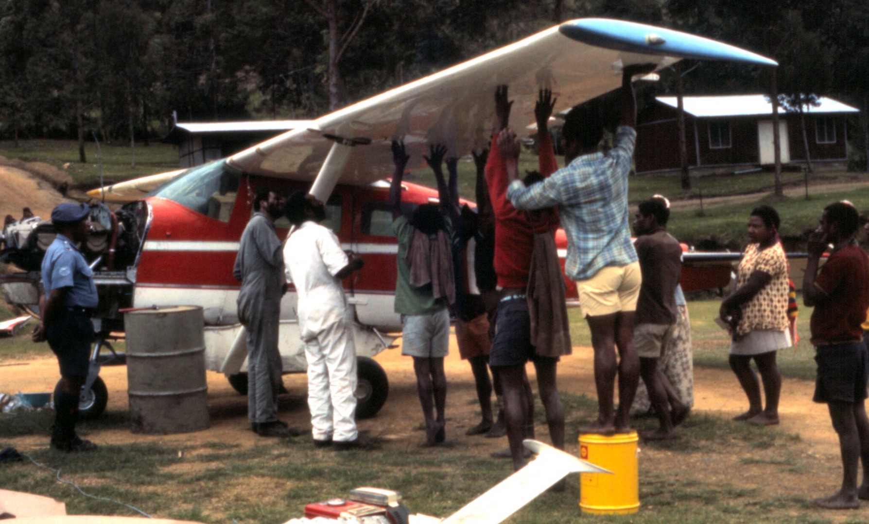 I needed a few spares for this job. Had them delivered by Twin Otter. A new set of wings, tail assembly engine prop fuel etc. The pilot in the picture is Max Parker 2nd chief pilot, test pilot, it was he who flew this poor plane out.