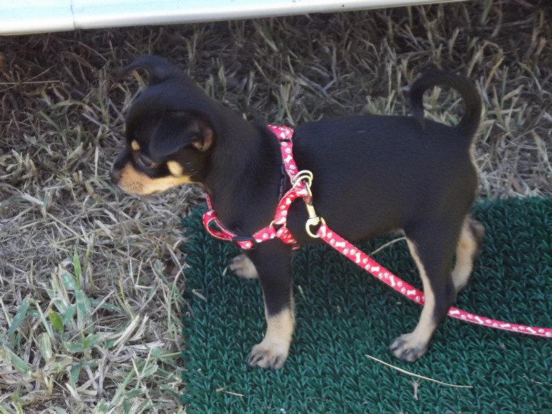 This is Daisy. She's now 4 months of age. Her mum is a Daschund x Chihuahua. Her dad a Pug. Have no idea what she is going to turn out like but she has very long legs.