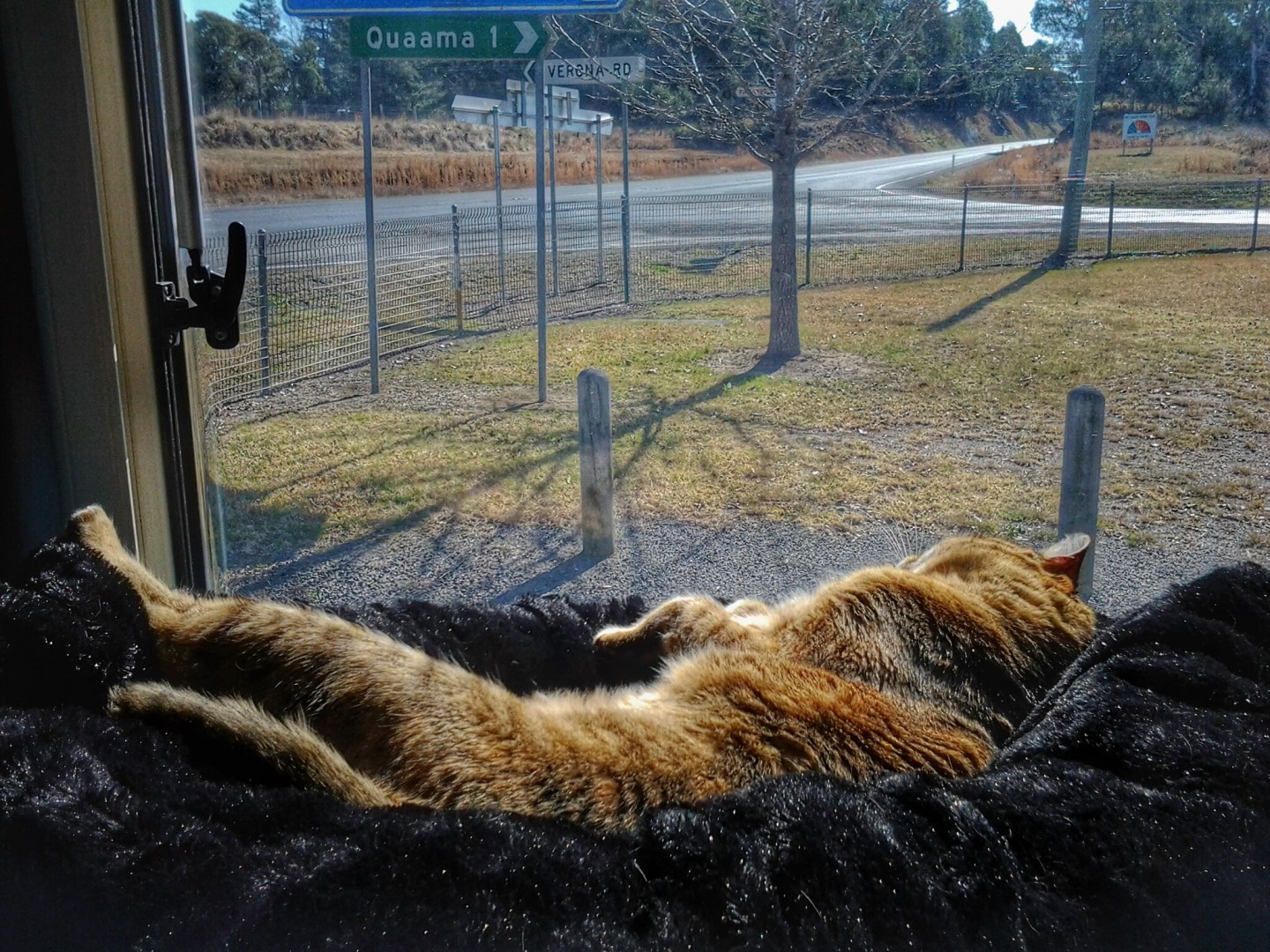 Frangipani, Thanks for the encouragement. I did meet 2 lovely ladies who were my neighbours in a motorhome for a few days and also a fellow Goldstream owner couple with a cute dog who got rather excited when she saw me walking my Purr Baby (cat) on her harness. Talking about exciting neighbours. .... well my Ranni was vibrating with excitement when she looked out of the windows this morning....see attached photo for the reason why! Currently at Scrubby Creek Rest Area 20km south of Eden NSW.