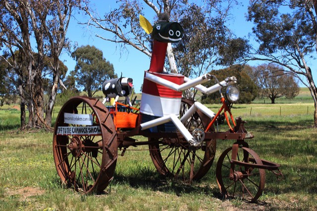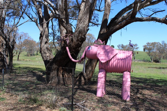 A VERY leisurely drive today. 60 km most of the way. Why..... Well - the roads were sealed but pretty rough and luckily there was very little traffic .... the scenery was wonderful - GREEN - so was soaking that up.... and I happened to be on the road from Mulong to Dubbo - otherwise know as the 'Animals on Bikes' road so had to go slow so I could enjoy them. Pity there are not many places to get off the road for more pictures - like the Tinhorse Highway' in WA - but did manage to get a couple of pix. Stopped at Yeoval for a great hamburger lunch and excellent coffee. Am now staying with friends on a property out of Wellington for a few days - at least until the long weekend and the school holidays are done and dusted! Cant remember when I last heard lambs - must be weaning time.
