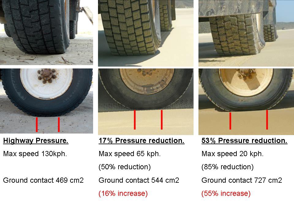A 50% reduction in highway pressure is quite dramatic and bust be accompanied by a serious reduction in maximum speed (in our case it wequires a MAXIMUM speed of 20kph. Exceeding that will overheat the sidewall and destroy the tyres.