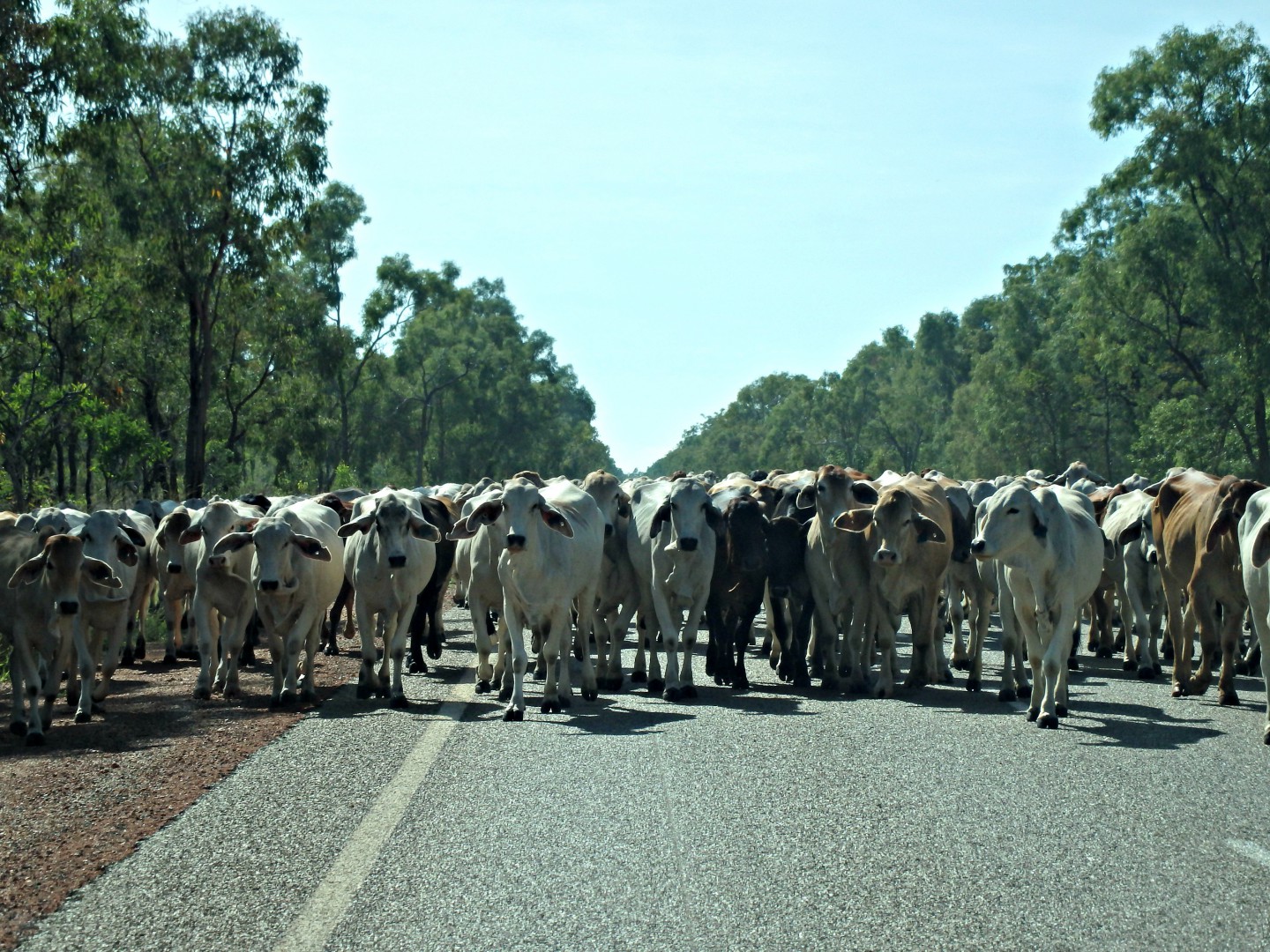 Driving slowing towing our caravan through the herd of cows in Mount Surprise, Queensland