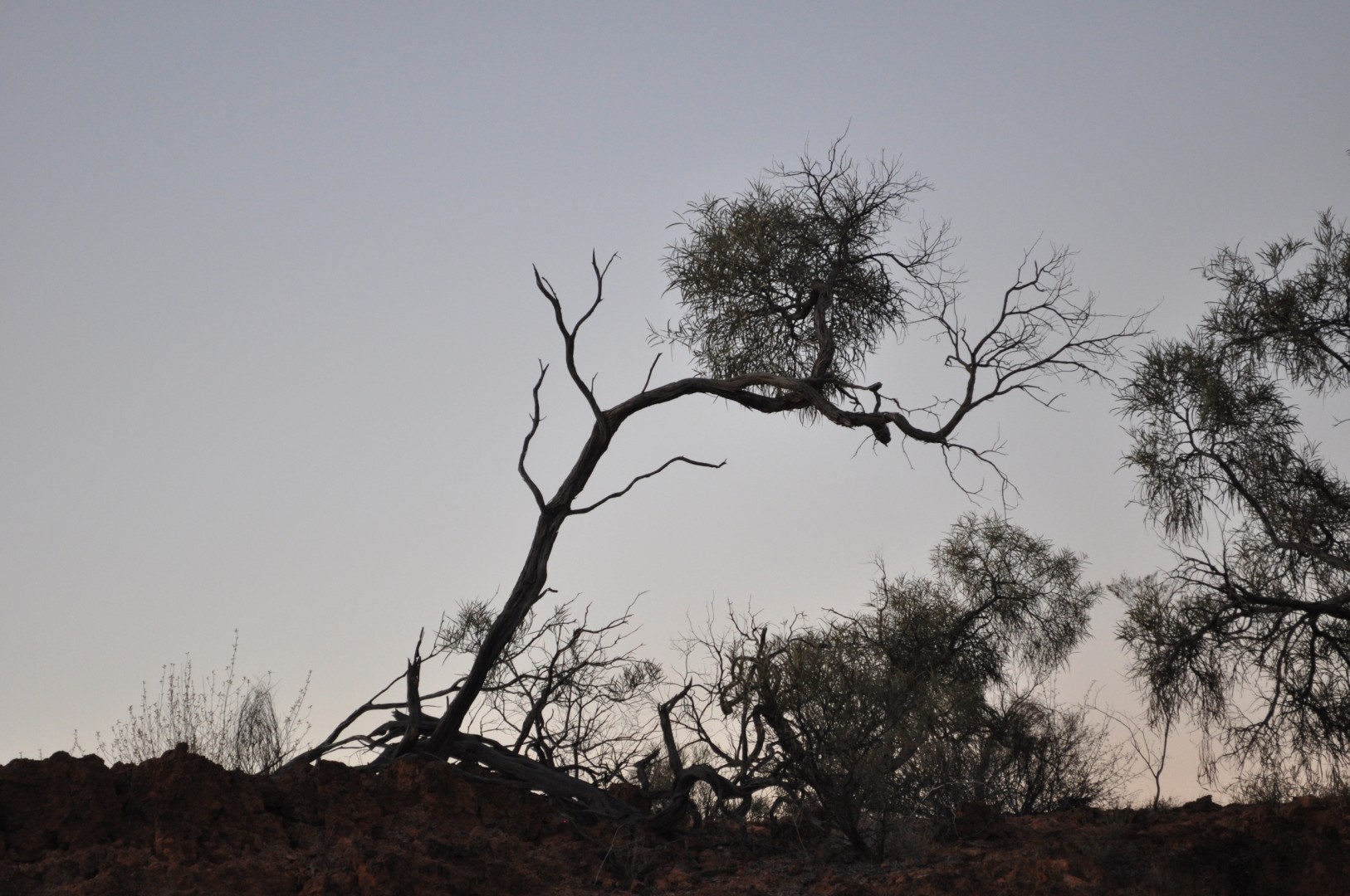 A Tree out in the bush. It has many dead limbs on the ground, but only one lonely branch alive.