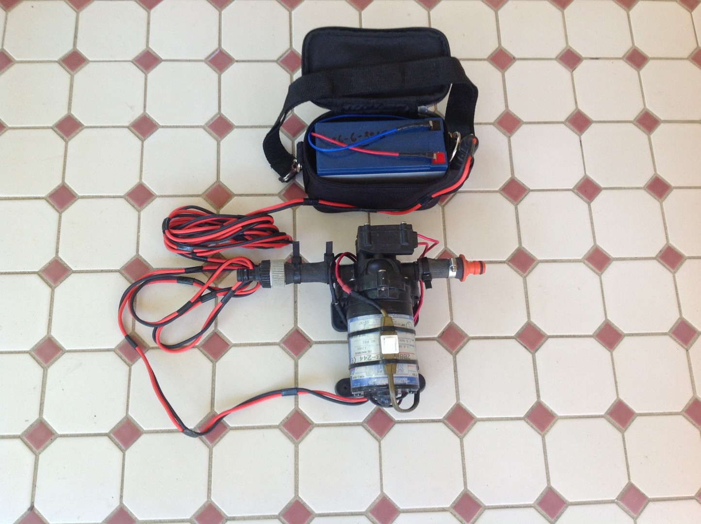 This is our system of transferring water from a container into the van or collecting water from a creek etc. We have been using this method for quite some time and it works really well. Runs from a 7amp hr battery which is in a carry bag with a cigarette lighter adaptor attached when away from the van. Just the normal hose fitting, the pump is a marine fresh water. Bessie