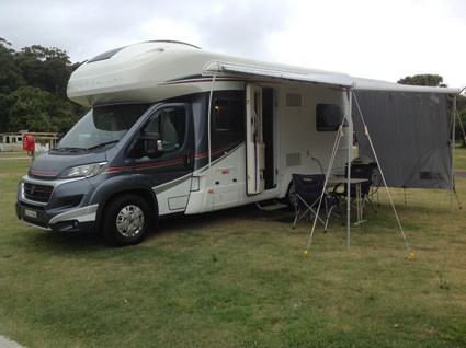 The roll out awnings with the arms to the bottom of the unit don't seem to be fitted to motorhomes. I'm not sure of the reason. Most motorhomes seem to be fitted with the cassette type. All of these need to be well secured with guy ropes (more so then roll out models) if you are going to have them out with minimum supervision.