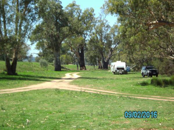 Camp right beside the clear fairly fast flowing McQuarie river, or alternatively up on the top of the high bank, good Sunny or Shady spots there for a few hundred metres. Good for internet, phone & dogs. Not much in the way of facilities apart from one long drop dunny and a a few bins. Dump point in Wellington 15-20 kms away. 14 day limit. Great for paddling, bathing, or kayaking, but don't lose hold of anything that floats or it will disappear quickly! Don't know where the 'falls' are, but in February at least this section is clear beautiful water, more than knee deep at the edge. Could be a popular swimming hole during School holidays I suspect, and gets busy at weekends. Currently only the ducks and ****atoos and 4 other rigs here!