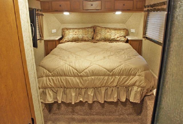 BEDROOM QUEEN BED AND MATTRESS - 6' 6" L X 5' W (Please note our recent brochure's "features" section went to a new format and incorrectly included pillow top mattress. We regret an inconvenience.) BULLET READING LIGHTS ABOVE BED NIGHT STANDS DOUBLE 240V OUTLET AT EACH NIGHT STAND HANGING WARDROBE WITH TWO DRAWERS OVERHEAD STORAGE COORDINATING DESIGNER COMFORTER LIFT UP BED WITH GAS STRUTS AND STORAGE TV JACK AND LCD TV BRACKET LARGE STORAGE AREAS UNDER FOLD UP STEP TO BEDROOM