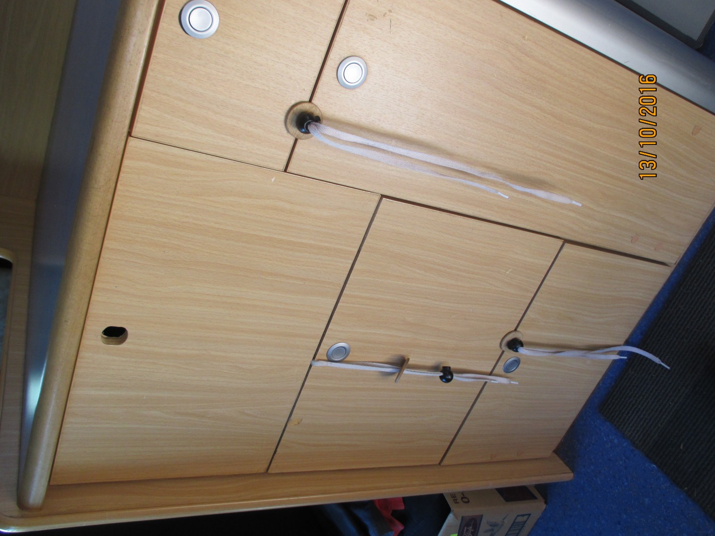 Drawers were another problem. I replaced one broken lock with a cupboard "U" catch but the constant movement sees me constantly tightening the screw which now has been replaced with a bolt. Still not 100% satisfactory, so I found a couple of bottle caps into which I drilled a hole then using a bootlace and the cap that seemed to work but now I have replaced the bottle cap with a 3-ply disc, shoelace and toggle (from a hat).