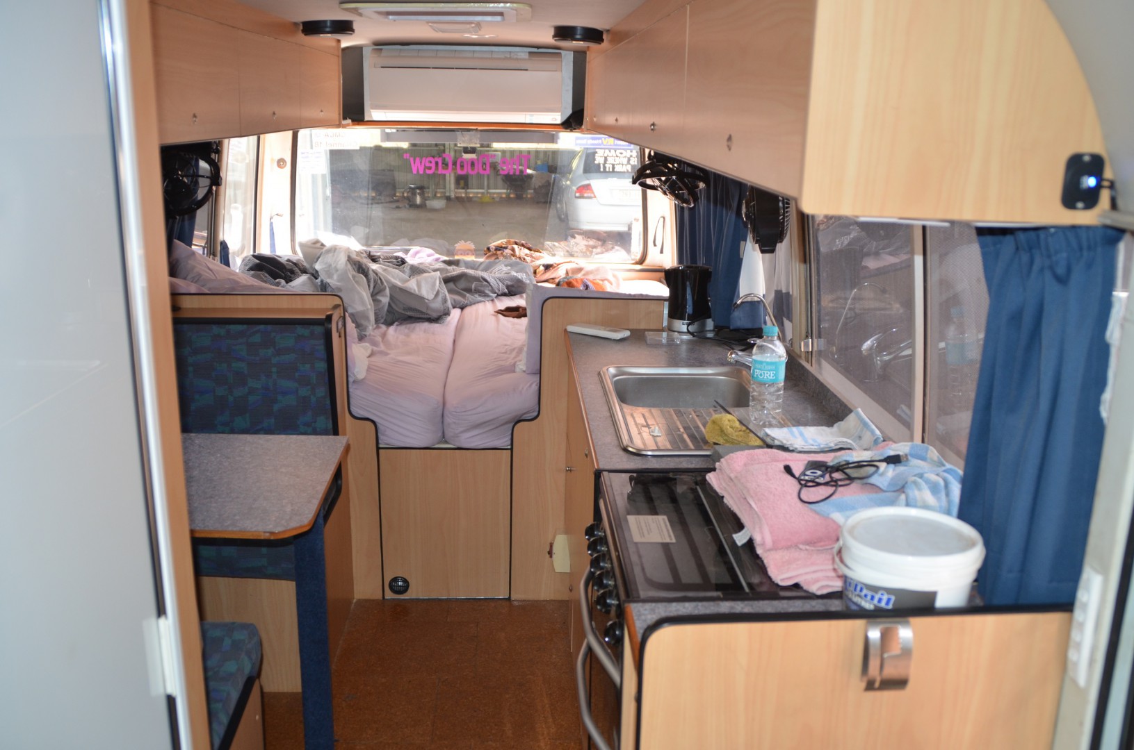 2 black Camfaro fans fitted under the cupboards on either side take care of air movement around the body core if needed, flap on the head unit is set level or your feet freeze. We wanted fans anyway as neither of us can sleep without a fan running even in cold southern states, consequence of living in the tropics for so long as our fans at home only get turned off to be cleaned.